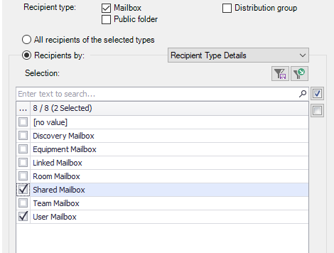 Recipient type grouping supports compliance initiatives by providing clear visibility into different categories of message recipients. When auditors need to understand how different types of accounts interact with sensitive information, you can generate precise reports that separate user mailboxes from shared resources.