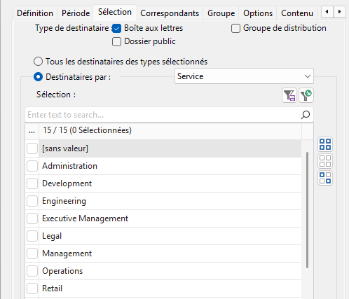 - Un onglet Sélection pour sélectionner les destinataires Exchange,