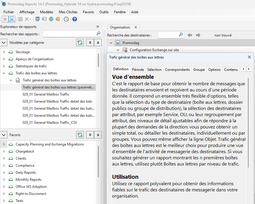 Ouvrez l'application et recherchez le modèle de rapport le plus approprié dans le volet de gauche, également connu sous le nom d'explorateur de rapports. Comme son nom l'indique, la catégorie Trafic des boîtes aux lettres est la plus pertinente. En haut de la liste, Trafic général des boîtes aux lettres inclut tout ce qu'il faut pour produire un tel rapport :