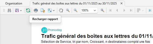 Les options du rapport peuvent être ajustées à volonté en cliquant sur l'icône de la flèche circulaire verte dans la barre d'outils du rapport :
