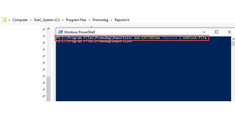 This usually happens when you update the application using a .zip file provided by Promodag. By default, PowerShell script files that were downloaded from the internet are blocked to protect the computer from untrusted files.