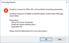 You may come across the following error when testing the connection of Promodag Reports to Office 365:
