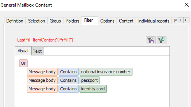 In this case you will use the General Mailbox Content report at the item detail level, and a complex filtering expression using the OR operator: